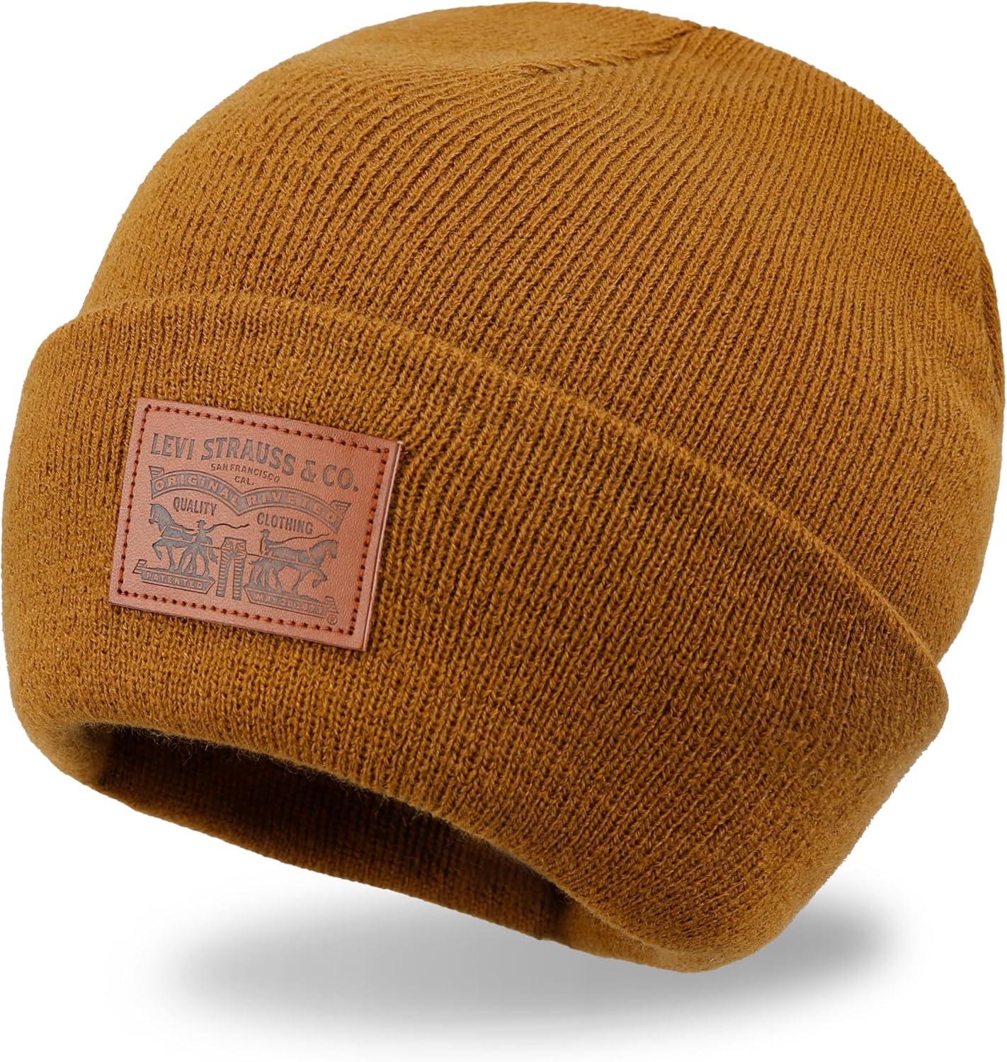 Levi’s All Season Comfy Leather Logo Patch Cuffed Hero Beanie(Tan)