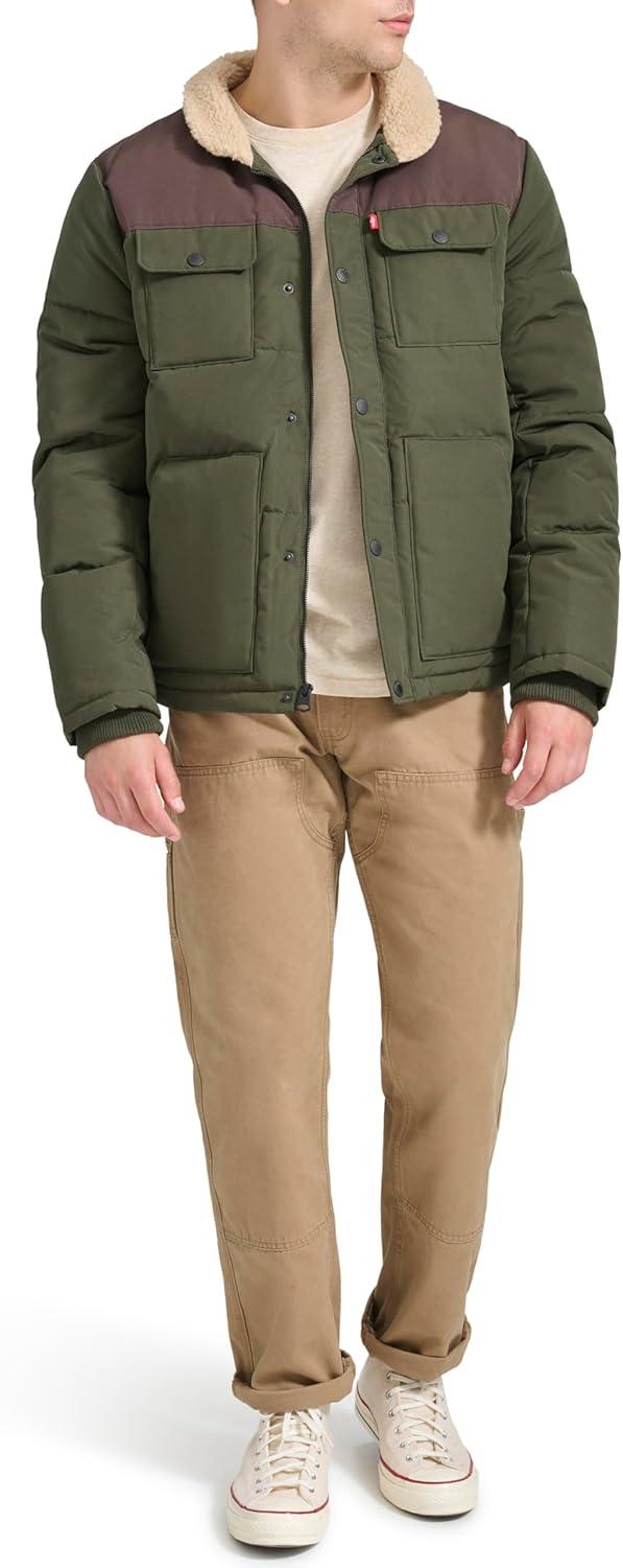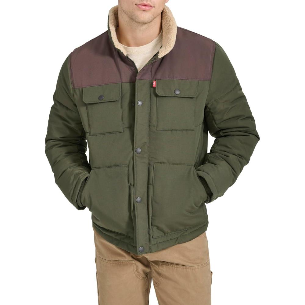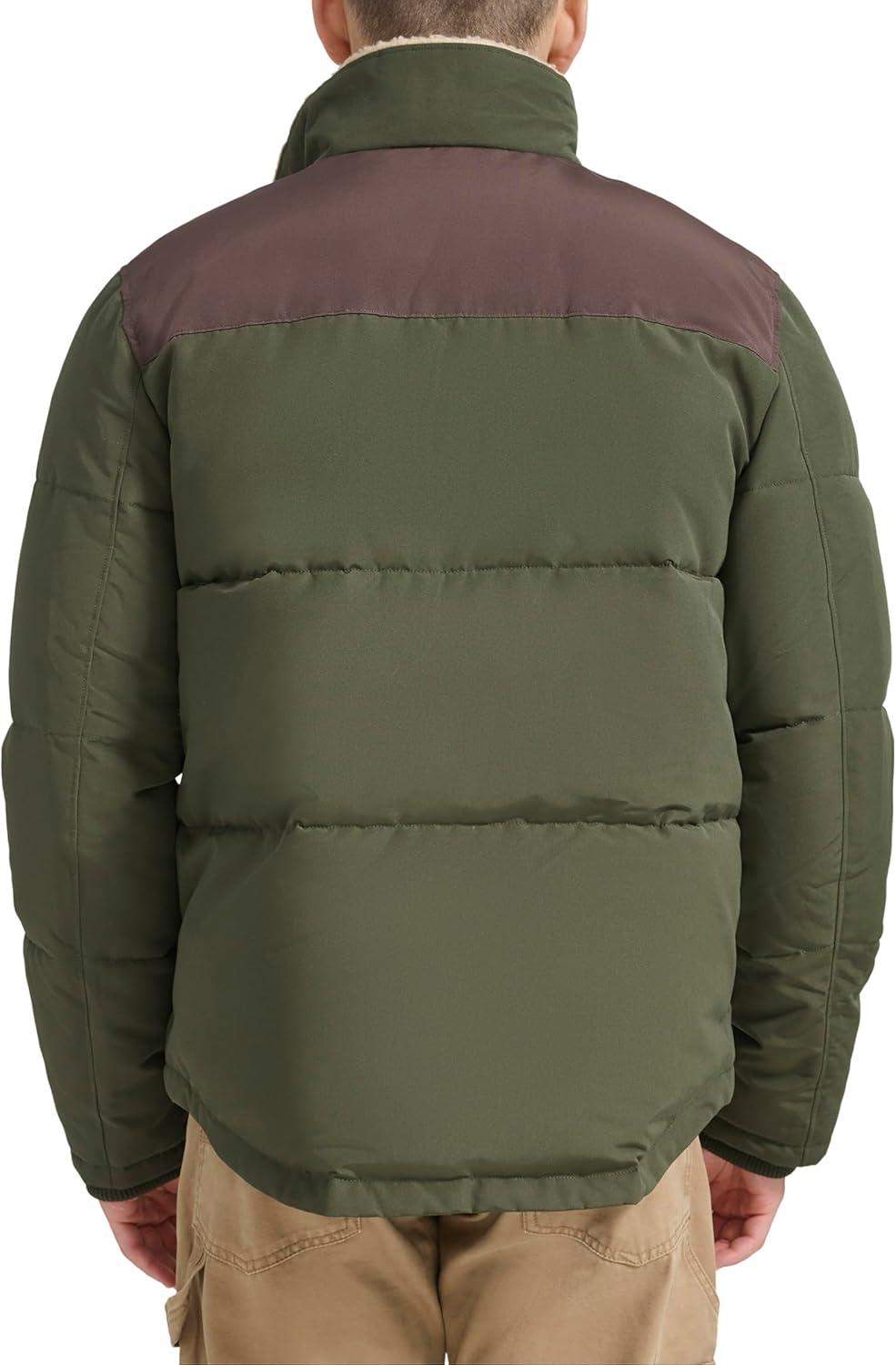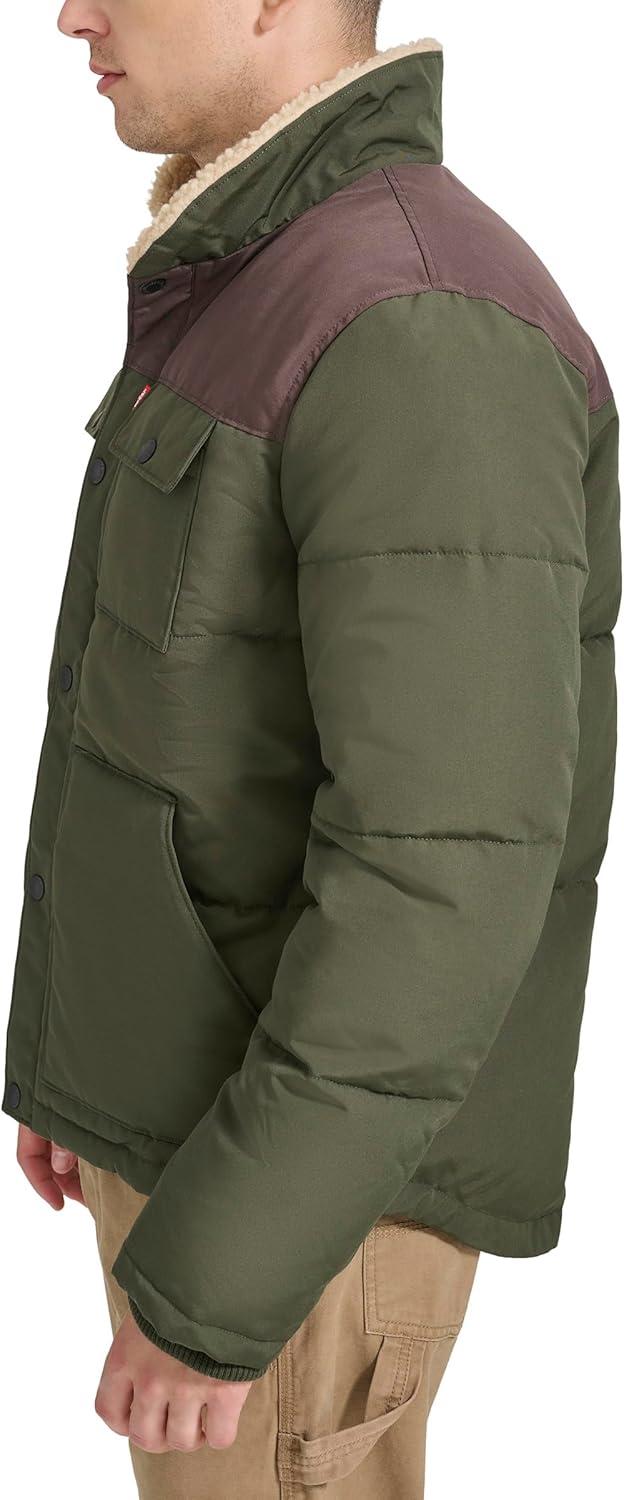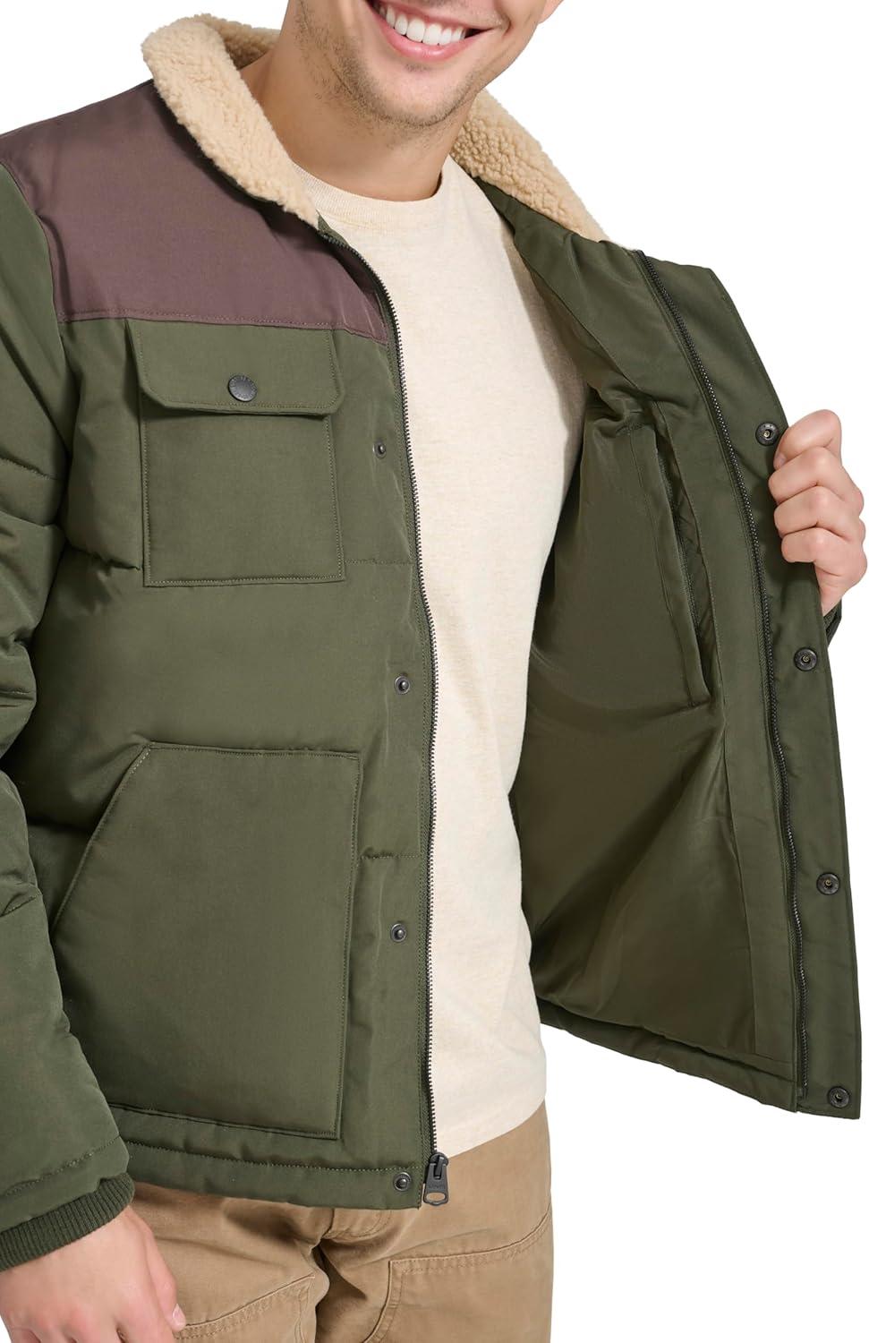 Levi’s mens Mixed Media Quilted Puffer Jacket With Sherpa Lined Collar (Regular and Big & Tall Sizes)(Olive/Dark Brown)